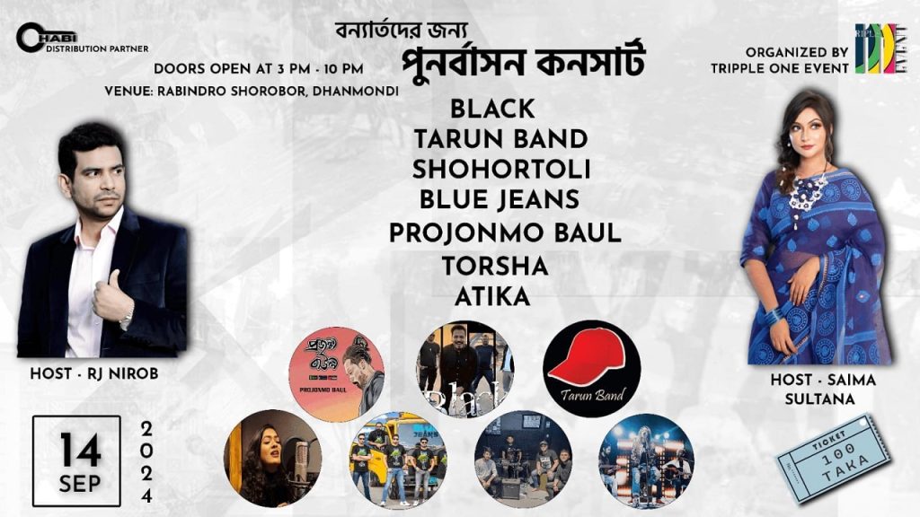 ‘পুনর্বাসন কনসার্ট’-এ পারফর্ম করবে মোট ৫টি ব্যান্ড। যেখানে থাকছে ব্ল্যাক, শহরতলি, তরুণ ব্যান্ড, ব্লু জিনস, প্রজন্ম বাউল, কণ্ঠশিল্পী তোরসা ও আতিকা।