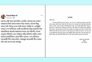প্রসঙ্গত, সামাজিক যোগাযোগমাধ্যমে Faruk Khan নামের যে ফেসবুক পোস্টের কথা কারা কর্তৃপক্ষ উল্লেখ করেছে, সেটি ভেরিফায়েড ফেসবুক অ্যাকাউন্টে দেওয়া হয়েছে বলে স্ত্রিনশটে দেখা যাচ্ছে। ওই পোস্টে লেখা হয়, ‘অনেক চেষ্টা করে অনলাইনে এসেছি। জেলের চার দেয়াল আমাদের নিজ সত্তার সামনে দাঁড়া করায়। অনেক কিছু বলতে চাই, কিন্তু এখন সবই বলতে পারছি না। এতটুকুই বলব শেখ হাসিনাকে নেত্রী মেনেছিলাম কিন্তু আজকে তাঁর হঠকারিতার জন্যই আমাদের দলের এই পরিণতি। দলের নেতৃত্বে পরিবর্তন এবং সর্বস্তরে শুদ্ধি অভিযান ব্যতীত কোনো ধরনের রাজনীতিতে ফেরা উচিত হবে না। শেখ হাসিনার আওয়ামী লীগ আর চাই না, বঙ্গবন্ধুর আওয়ামী লীগ ফেরত চাই। জয় বাংলা জয় বঙ্গবন্ধু।’