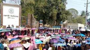রোববার (৯ মার্চ) বিভিন্ন বিভাগের শিক্ষার্থীরা ক্লাস পরীক্ষা বর্জন করে বেলা ১২টায় বিশ্ববিদ্যালয়ের জোহা চত্বরে জড়ো হন। পরে সেখান থেকে মিছিল নিয়ে বিশ্ববিদ্যালয়ের মেইনগেট সংলগ্ন রাজশাহী-ঢাকা মহাসড়ক অবরোধ করেন তারা। এসময় যান চলাচল সম্পূর্ণ বন্ধ হয়ে যায়।