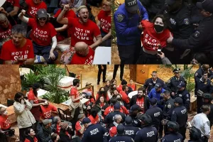 এসময় ৯৮ জন বিক্ষোভকারীকে গ্রেফতার করে পুলিশ। গ্রেফতারকৃতদের পরনে থাকা লাল টি-শার্টে লেখা ছিল, ‘ইহুদিরা বলছে, ইসরায়েলকে অস্ত্র দেওয়া বন্ধ করুন’। তাদের হাতে ছিল ব্যানার আর ‘এখনই খলিল মাহমুদকে মুক্তি দিন’ বলে স্লোগান দিচ্ছিলেন।