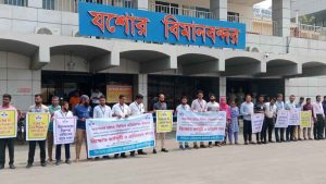 সোমবার (১৭ মার্চ) বেলা সাড়ে ১১টায় যশোর বিমানবন্দরে সামনে তারা এ মানববন্ধন কর্মসূচি পালন করেন। ঘণ্টাব্যাপী মানববন্ধনে শতাধিক কর্মকর্তা-কর্মচারী অংশ নেন।