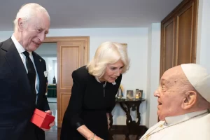ভ্যাটিকানে পোপের সাথে ব্রিটিশ রাজা ও রানির একান্ত সাক্ষাতের একটি ছবি প্রকাশ করা হয়েছে। বুধবার সেখানে বাকিংহাম প্যালেস জানিয়েছে, রাজা চার্লস এবং ক্যামিলা তাদের আতিথ্য দেয়ার জন্য এবং ব্যক্তিগতভাবে তাদের পোপের সাথে শুভেচ্ছা বিনিময় করতে পেরে আনন্দিত। পোপও এসময় তাদের ২০তম বিবাহ বার্ষিকীর শুভেচ্ছা জানান।