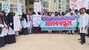 মঙ্গলবার (১৫ এপ্রিল) সকাল ৮টা থেকে মেডিকেল কলেজ প্রাঙ্গণে মানববন্ধন ও ক্লাস বর্জন কর্মসূচি পালন করছেন মেডিকেলের দ্বিতীয়, তৃতীয় এবং চতুর্থ ব্যাচের শিক্ষার্থীরা।