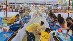উৎসবে তরুণ-তরুণীরা মুখোমুখি হয়ে ছোট ছোট পাত্রে রাখা পানি একে অপরের দিকে ছুড়ে দেন। বাঁশির তালে তালে চলে দলীয় পর্যায়ে পানি ছিটানো। এই খেলায় যেমন আনন্দ উল্লাসে মেতে ওঠে সবাই, তেমনি তরুণ তরুণীদের কাছে এটি হয়ে উঠে একে অপরের প্রতি অনুভূতি প্রকাশের মাধ্যম।