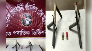 শনিবার (১৯ এপ্রিল) রাতে সদর উপজেলার বিষ্ণুপুর এলাকার ঢালী বাড়ি মসজিদ সংলগ্ন মাঠ থেকে এসব অস্ত্র ও কার্তুজ উদ্ধার করা হয়।