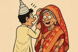 বিয়ের আসর সাজানো, অতিথিদের ভিড়, মিষ্টির গন্ধে ভরপুর পরিবেশ—সবই ঠিকঠাক চলছিল। কিন্তু যখন পাত্র জানতে চাইলেন তার হবু স্ত্রীর নাম, তখনই ঘটল বিপত্তি। কনের নাম শুনেই আঁতকে উঠলেন বর। ঘোমটার আড়াল থেকে বেরিয়ে এলো এক অবিশ্বাস্য সত্য—কনের জায়গায় বসে আছেন পাত্রীর মা, অর্থাৎ হবু শাশুড়ি!
