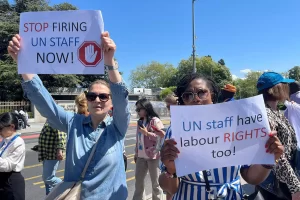 যুক্তরাষ্ট্র এবং অন্যান্য দাতাদের সহায়তা হ্রাসের ফলে বিশ্বব্যাপী চাকরি হারিয়েছেন জাতিসংঘের শত শত কর্মী। এর প্রতিবাদে বৃহস্পতিবার জেনেভায় জাতিসংঘের ইউরোপীয় সদর দফতরের সামনে বিক্ষোভ করেছেন বৈশ্বিক এ সংস্থার কয়েকশ’ কর্মী।