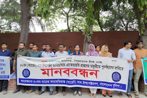 সোমবার সকাল ১০টার দিকে রাজধানীর গুলিস্তানে পুলিশ সদর দপ্তরের সামনের সড়কের এক পাশে এই মানববন্ধন কর্মসূচি শুরু হয়। মানববন্ধন শেষে পুলিশের মহাপরিদর্শক (আইজিপি) বাহারুল আলম বরাবর স্মারকলিপি দেওয়া হয়।