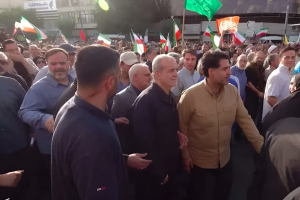 ইরানের সংবাদমাধ্যম মেহের নিউজ এজেন্সির খবরে বলা হয়, ইনকিলাব স্কয়ারে বিক্ষোভকারীদের সঙ্গে যোগ দেন প্রেসিডেন্ট মাসউদ পেজেশকিয়ান। বিক্ষোভকারীদের কয়েকজনের হাতে ছিল প্ল্যাকার্ড। যাতে যুক্তরাষ্ট্র ও ইসরায়েলবিরোধী স্লোগান লেখা ছিল। কোনোটিতে লেখা ছিল, ইরান আমাদের মাতৃভূমি। তার মাটি আমাদের সম্মান, তার পতাকা আমাদের কাফন।