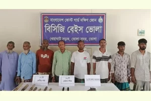 ভোলার দৌলতখান উপজেলায় ধারালো অস্ত্র ও একটি দেশীয় পিস্তলসহ ৮ জন ডাকাতকে আটক করেছে কোস্ট গার্ড।