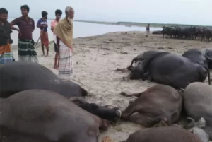 প্রাণিসম্পদ বিভাগ ও স্থানীয় সূত্রে জানা গেছে, বাংলাবাজার এলাকার নওয়াজুদ্দিনের ছেলে নবির আলীর ১০টি মহিষ এবং একই এলাকার এলাহি ঢালির একটি মহিষ বজ্রপাতে মারা যায়। এসময় মহিষগুলো নদীর পাড়ের উঁচু স্থানে আশ্রয়ে ছিল বলে নিশ্চিত করেছেন স্থানীয়রা।