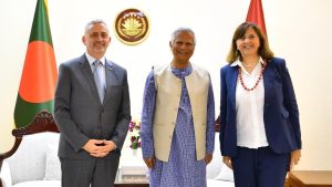 বুধবার (৬ নভেম্বর) দুপুরে ঢাকার তেজগাঁওয়ে প্রধান উপদেষ্টার কার্যালয়ে তার সঙ্গে সাক্ষাৎ করতে যান ঢাকায় নিযুক্ত ইইউর রাষ্ট্রদূত মাইকেল মিলার ও সফররত এক্সটার্নাল অ্যাকশন সার্ভিসের এশিয়া ও প্যাসিফিক বিভাগের পরিচালক পাওলা পামপোলিনি। সাক্ষাৎকালে তারা এ কথা বলেন।